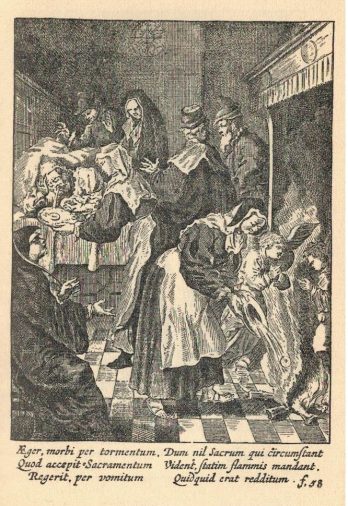 De priester was nog maar net weggegaan of de zieke man begon geweldig te hoesten. Zijn vrouw liep naar hem toe, om hem trachten te helpen, maar haar echtgenoot rochelde en stikte bijna, en braakte de inhoud van zijn maag uit, inclusief de Hostie die nog intact was. De vrouw reageerde instinctief. Ze schepte de Hostie op in gooide het in het haardvuur. Ze besefte al gauw haar zware fout, maar het vuur raasde en ze was niet in staat om haar hand erin te steken, uit angst om zich te verbranden. Die nacht sliep ze zeer slecht, draaiend en woelend. Ze was bang dat ze een vreselijke zonde had begaan en ze had nachtmerries over de Heilige hostie de ze in het vuur had geworpen.