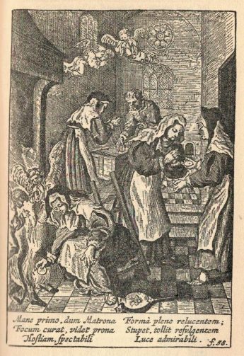 De volgende morgen, van zodra ze uit bed was, ging ze naar de open haard. Het vuur was nog niet gedoofd, want de kolen waren nog zeer heet. Ze pookte in de kolen en zicht naar de Hostie. Tot haar verbazing zag ze plots de Hostie liggen op een brandende kool. Het was in het geheel niet verbrand. Ze pakte de Hostie onmiddellijk vanuit het vuur en wikkelde het zorgvuldig in een propere linnen doek en plaatste het vervolgens in een kist, om het veilig te bewaren.