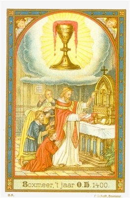 In het jaar 1400 zou priester Arnoldus Groen (†1419) tijdens het celebreren van de mis onder de consecratie hebben getwijfeld aan de transsubstantiatie van brood en wijn in respectievelijk het lichaam en het bloed van Christus. Daarop veranderde de wijn in bloed dat over de miskelk op het corporale bruiste. De geschrokken priester kwam onmiddellijk tot inkeer en het bloed veranderde weer in miswijn, met uitzondering van datgene wat op het corporale terecht was gekomen. Dit H. Bloed op het altaardoek stolde tot een rode klomp