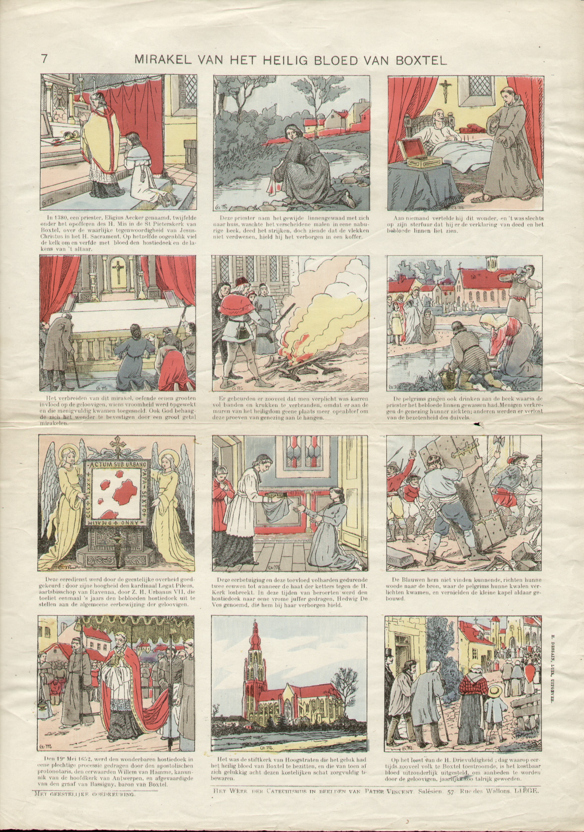 Dit mirakel gebeurde in 1380, toen priester Eligius Van den Aker in de Sint-Petruskerk van Boxtel de Heilig Mis aan het opdragen was. Eligius stootte per ongeluk op het Driekoningenaltaar de kelk om met het Heilig Bloed dat uit witte wijn was geconsacreerd. De corporaaldoek en de altaardoek werden met rode vlekken gekleurd.