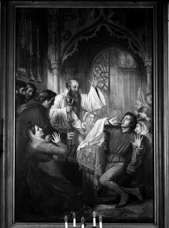 Er leefde in 1374 in Middelburg een vrome edelvrouw, die erop stond dat al haar huisgenoten waardig zouden communiceren op de eerste zondag van de vasten. Eén van hen, Jan, afkomstig uit Keulen, ging zonder gebiecht te hebben en zonder berouw te Communie. Nauwelijks had hij de Hostie ontvangen of hij werd door blindheid getroffen; bovendien veranderde de Hostie in zijn mond in een stuk Vlees. Toen hij er in beet sprongen drie druppels bloed uit zijn mond op de communiedoek. De priester die de Communie uitdeelde schrok en nam het Vlees uit Jans mond om het vervolgens veilig weg te bergen. Jan smeekte publiekelijk om Gods genade, waarna hij door een nieuw wonder van zijn blindheid werd genezen. Voortaan leidde hij een voorbeeldig leven. De in Vlees veranderde Hostie en de communiedoek werden vervolgens als relieken bewaard.
